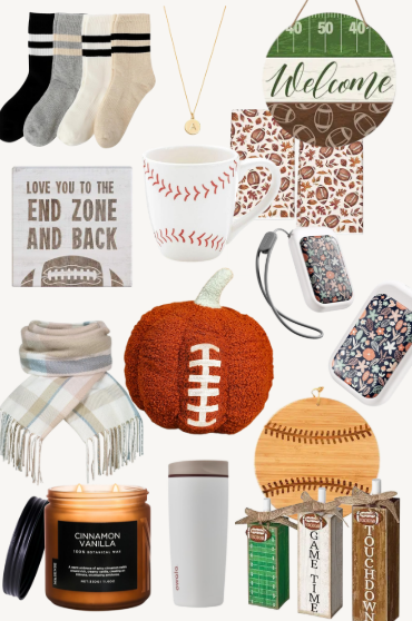 For the Moms Sideline Style Whether you’re cheering from the bleachers, hustling through morning drop-off, or heading to a post-game lunch, these outfit ideas are designed to keep you comfortable, confident, and effortlessly chic. Today’s sports mom style blends athleisure ease with fashion-forward flair, so you can look put-together without sacrificing comfort. Fall 2025 Accessories, Decor, & More Fall must-haves for sports moms go beyond the sidelines—think cozy custom blankets, team-themed porch signs, and stylish accessories like insulated tumblers and spirit jewelry. Add flair to your home with sporty pumpkin decor. Perfect gifts to fill a “Boo” basket for your favorite sports mom!